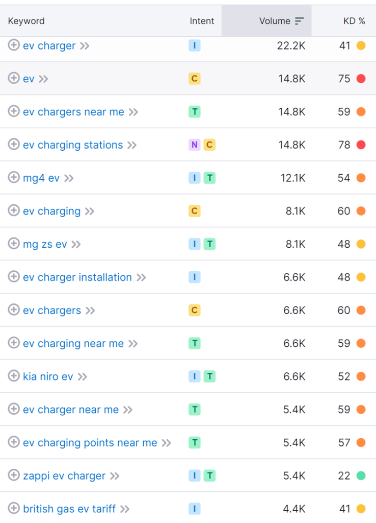 One of the key talking points in the electric vehicle space, especially from a consumer perspective, is the efficiency and reliability of charging. With an infrastructure still in development, it’s easy to understand why this is the case. To illustrate this, I looked at the seed keyword “ev”. The table below shows the top 15 keywords in relation to this seed. It’s no surprise that 9 out of the 15 keywords are relating to the charging aspect of owning an electric vehicle.